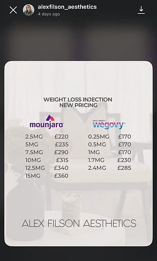 When we approached Filson for weight loss jabs, she sent us details (pictured) about prices and dosages