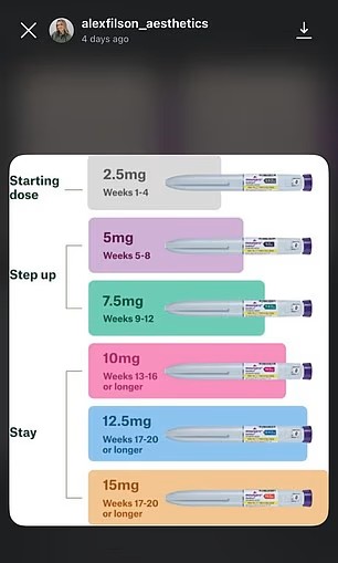 Selling the jabs through her Instagram, she wrote: 'Lots of clients have been asking me about weight loss injections since Mounjaro went up. I can get Retatrutide 40mg pens which last around 10 weeks are £200.